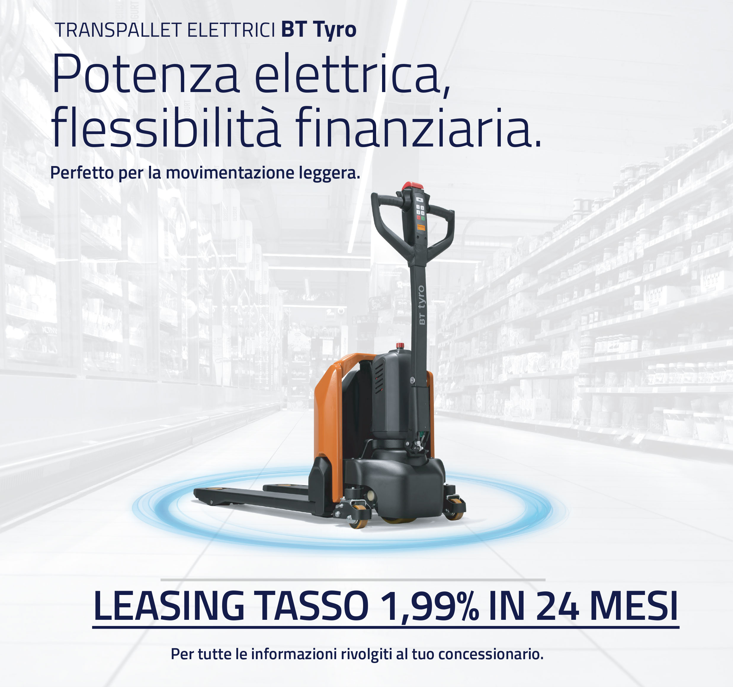 Offerta valida per i transpallet elettrici BT Tyro a fronte dell’adesione al leasing con Toyota Material Handling Commercial Finance AB. Finanziamento Leasing in 24 MESI a TASSO 1,99% con canoni mensili e valore di riscatto 1%.